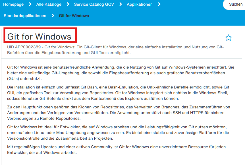 Suche im Serviceportal unter Standardapplikationen nach “Git for Windows”